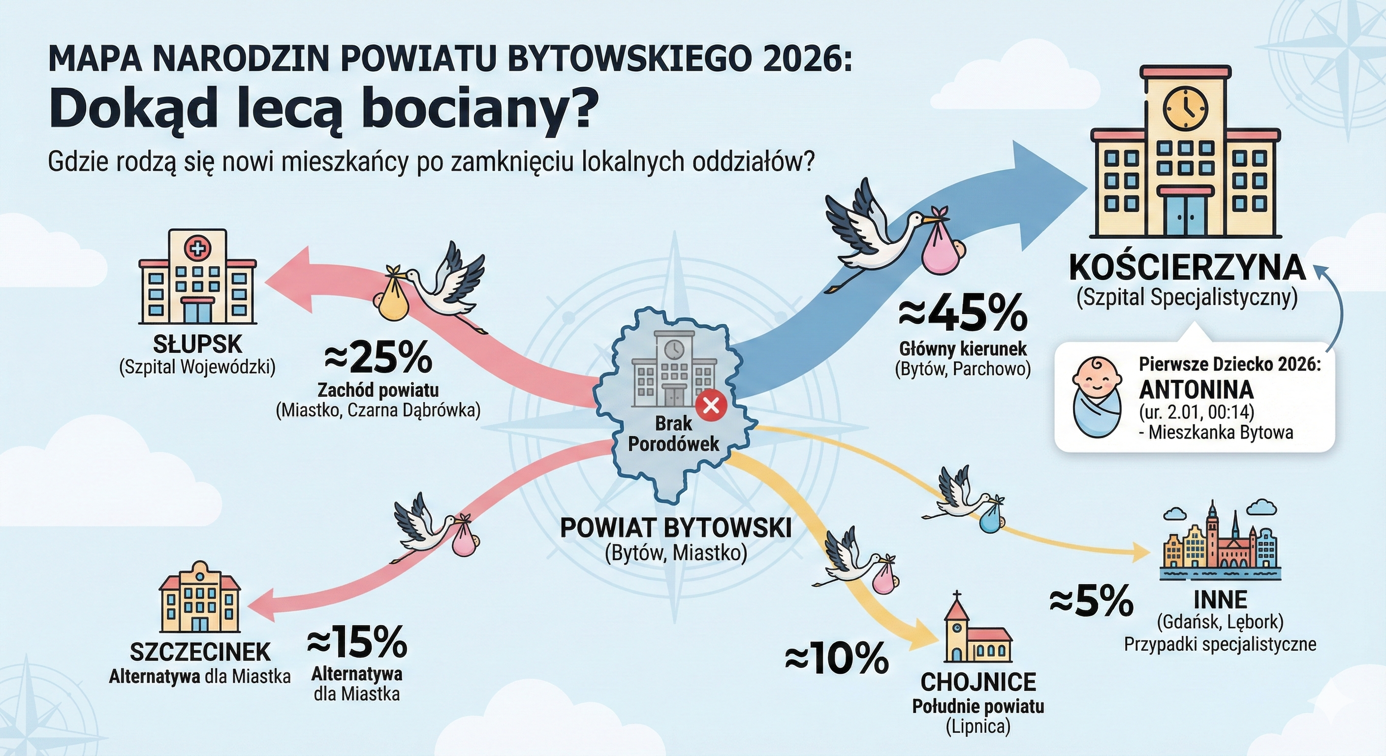 Dzisiejsi młodzi rodzice z Bytowa czy Parchowa nie jadą już do szpitala przy ul. Lęborskiej. Ruszają w trasę do Kościerzyny, Słupska, a czasem nawet Lęborka czy Szczecinka. W efekcie w dowodach osobistych przyszłego pokolenia coraz rzadziej będziemy oglądać nazwę naszego miasta jako miejsca urodzenia. Paradoksalnie, to właśnie sąsiednie powiaty stają się świadkami pierwszych chwil mieszkańców ziemi bytowskiej.