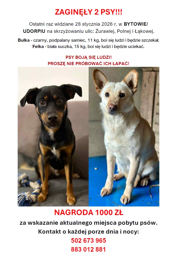 Psy zaginęły 28 stycznia 2026 roku. Ostatni raz widziano je na skrzyżowaniu ulic Żurawiej, Polnej i Łąkowej. Właścicielka ostrzega, że oba czworonogi boją się ludzi. Bułka prawdopodobnie będzie obszczekiwał nieznajomych, natomiast Felka rzuci się do ucieczki przy próbie kontaktu.