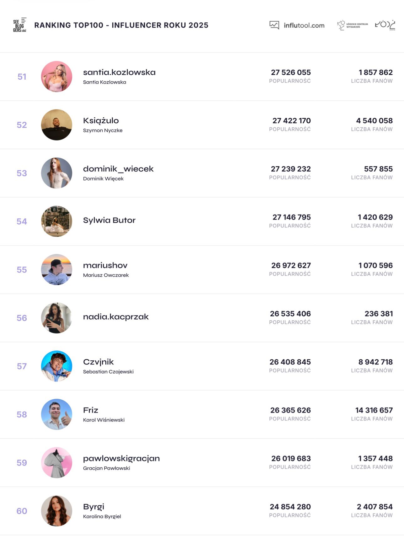 Za nominacją stoi jednak nie tylko rozpoznawalność, ale również konkretna pozycja w branży. Owczarek zwraca uwagę, że został też wcześniej wyróżniony w rankingu Top 100 najlepszych influencerów w Polsce, gdzie znalazł się na 55. miejscu.