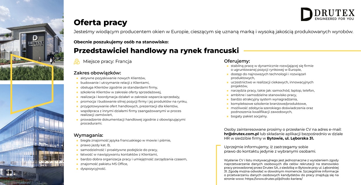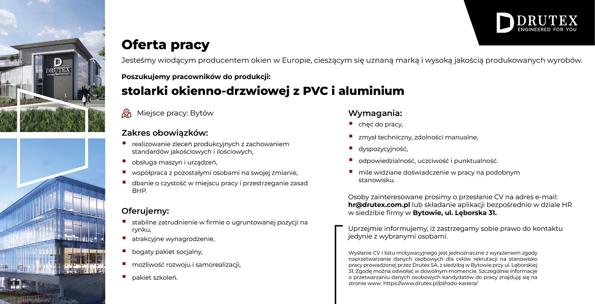 Drutex w 17-tysięcznym Bytowie zatrudnia obecnie 3850 pracowników. Firma poszukuje specjalistów IT, inżynierów, konstruktorów, osób ze znajomością języków obcych, jak i pracowników do produkcji okien, drzwi i rolet ponieważ zapotrzebowanie na jej produkty stale rośnie. Oferuje atrakcyjne warunki i stabilne zatrudnienie, a także liczne pakiety socjalne. Jest od lat nie tylko jednym z największych, ale i najbardziej cenionych pracodawców na Pomorzu. I stale się rozwija. Jeszcze w tym roku gotowy będzie nowoczesny biurowiec o powierzchni ponad 5 tys. m2. Rozpocznie się też budowa nowej hali produkcyjnej o powierzchni 75 tys. m2. Oznacza to nie tylko zwiększenie możliwości produkcyjnych, ale też zatrudnienia. Drutex co roku na inwestycje przeznacza dziesiątki milionów złotych.