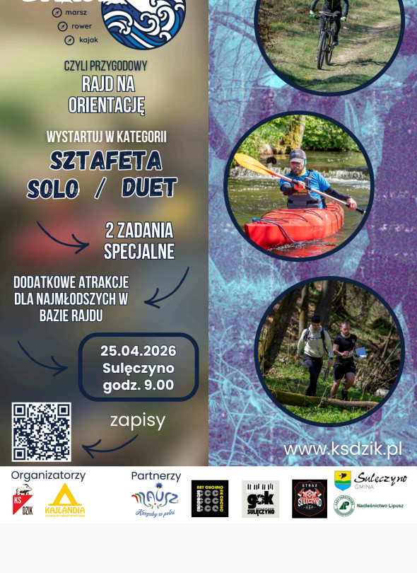 Druga edycja rajdu na orientację, który łączy trzy środki transportu: bieg, jazdę na rowerze oraz pływanie kajakiem. Do pokonania około 50 km, limit czasu 10h. Tym razem poszerzony o dwa zadania specjalne i niecodzienne atrakcje dla najmłodszych w bazie rajdu (np. darmowe przejazdy drezyną ręczną i gra terenowa przygotowana przez Nadleśnictwo).