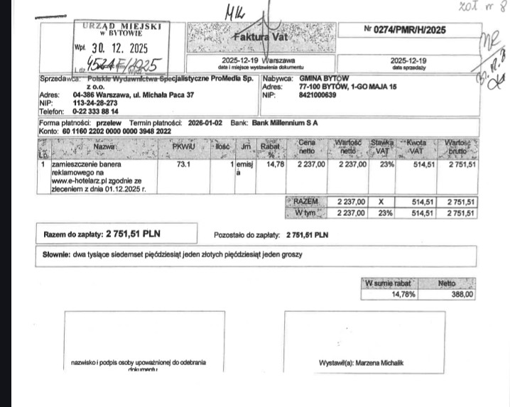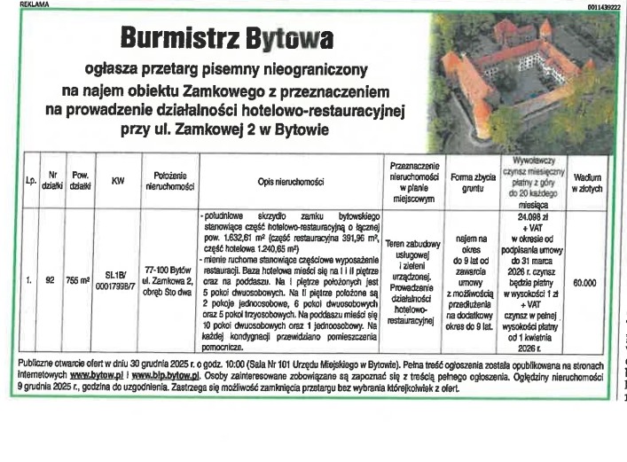 Gmina Bytów nie oszczędzała na nagłośnieniu przetargu, którego finał zaplanowano na 30 grudnia 2025 roku. Informacja o możliwości wynajęcia ponad 1,6 tysiąca metrów kwadratowych powierzchni hotelowo-restauracyjnej trafiła do mediów regionalnych i branżowych. Rachunek za tę operację jest konkretny: łączny koszt kampanii przekroczył 4000 złotych brutto.