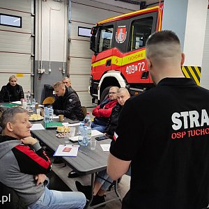 Na miejscu pojawiły się również dodatkowe elementy, które miały zachęcać mieszkańców do rozmów o bezpieczeństwie. Druh Sylwester Kręcki prowadził konsultacje dotyczące czujek czadu i dymu, przypominając, że takie urządzenia potrafią uratować życie w domu, szczególnie w sezonie grzewczym. Na uczestników czekała też okazja do zdobycia jubileuszowego „Strażackiego Kalendarza” OSP Tuchomie na 2026 rok, wydanego z okazji 80-lecia jednostki.